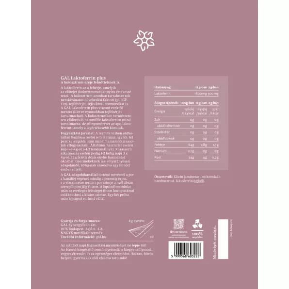 A laktoferrin az a fehérje, amelyik az előtejet (kolosztrumot) annyira értékessé teszi. A kolosztrum azonban tartalmaz sok nemkívánatos növekedési faktort (pl. IGF-1-et), tejfehérjét, tejcukrot, hormonokat is. A GAL Laktoferrin plus viszont ezektől mentes (illetve nyomokban tejfehérjét tartalmazhat). A kolosztrumban természetesen előforduló háromféle laktoferrint mind tartalmazza, de túlnyomórészt az apo-laktoferrint, amely a legértékesebb közülük. Ezt a terméket a Táplálkozás-Beállítás™ szakmai csapatával közösen fejlesztettük.