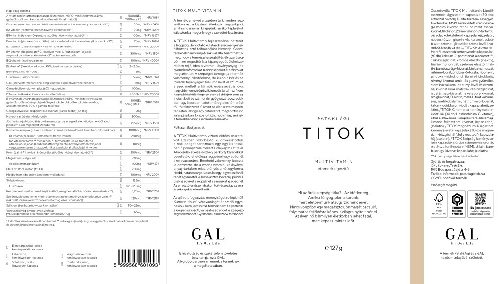 Felhasználási javaslat: A TITOK Multivitamin vízben oldódó összetevőit a zsírban oldódóaktól különválasztottuk, a napi adagot tartalmazó egy-egy kis tasakban 5 porkapszula mellett 1 olajkapszulát talál. A kapszulák étkezés közben, pár korty folyadékkal bevehetők, lehetőleg a reggelinél vagy ebédnél, s ne a vacsoránál. Bevehető valamennyi kapszula egyszerre, de a magas vitamin- és ásványianyag- tartalom miatt előnyös a két egyforma, kisebb, sárga kapszulát egy-egy étkezésnél, tehát egymástól különválasztva bevenni, például csak az egyiket a reggelinél, s a másikat az ebédnél. Az emésztőrendszeri diszkomfort-érzést így az arra érzékenyek is elkerülhetik.